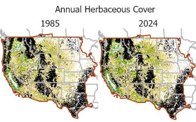 The RCMAP product suite includes 10 components: annual herbaceous, bare ground, herbaceous, litter, non-sagebrush shrub, perennial herbaceous, sagebrush, shrub, tree, and shrub height. Data characterize the percentage of each 30-meter pixel in the Western United States covered by each component for each year from 1985-2024 - providing change information for 40 years. This RCMAP update also expands mapping east to include the Great Plains and the grasslands biome.